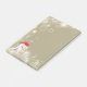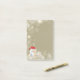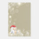 Um conjunto de notas pegajosas com uma ilustração de uma pequena criatura de neve de Natal fofa, boneca de brinquedo, vestindo um chapéu de Papai Noel vermelho. O pequeno monstro da neve tem uma corda de tração para fazê-lo falar e ele está coberto de pele branca macia com sotaques castanhos-claros. O fundo é uma cor castanho esticada com luzes cintilantes e flocos de neve.