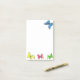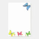 Borboletas brancas e coloridas azuis e amarelas com pontos de configuração de aparência metálica dourada em Posto_it de fundo branco.