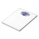 Um bloco de notas com a arte de corte de madeira vintage de uma cesta de margaridas e outras flores em azul e branco.
