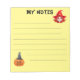 Um bloco de anotações amarelo-claro com linhas verticais pretas e duas ilustrações: um retrato de uma bruxa fofa no canto superior direito e uma abóbora vestindo uma bruxa no canto inferior esquerdo. No topo diz "As minhas notas" - palavras que podem ser facilmente substituídas de acordo com o seu próprio gosto.