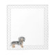 A ilustração original do desenho de Destei de um lindo cabelo liso preto e casaco de cor castanha Dachshund. O meio é branco, enquanto as bordas têm um padrão de estampas de cinza.