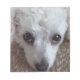 Pequeno cão de Poodle branco com olhos castanhos grandes.