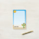 Cartoon de cacto sorridente com óculos de sol na paisagem desértica segurando uma caneca de cerveja e dando polegares para cima. Texto personalizado.