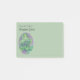 O texto personalizado figura neste bloco de notas de posto embelezado com trabalho de arte pastel, que representa três trevas ou lamelas em verde macio sobre fundo roxo mudo.