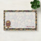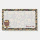 Ilustração de desenho animado de coruja sentada em galho de árvore sobre folhas de fundo sem costura escuro. Custom Text.