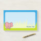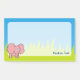 Um desenho animado de elefante de bebê rosa e bonito na grama e fundo do céu. Texto personalizado.