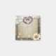 Modelo de Notas Post-it® para Jantar de Ensaios / Chá de Noiva / Celebração de Casamento / Festa de Noivado no Estilo Rústico Country - Casal Velho Coração de Ferradura com Nó de Cordão e Renda Branca, Girassol, Luzes de Corda e Tecido de Sarja em Fundo de Madeira de Celeiro Velho. Um Design Perfeito para o Seu Grande Dia. Todos os estilos de texto, cores e tamanhos podem ser modificados para atender às suas necessidades!