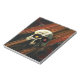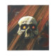 Caveira mau com tomadas oculares brilhantes e um fundo escuro com padrões de fundo com listras de laranja, marrom e preto. Feliz Dia das Bruxas, mortais.