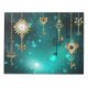 Chaves Douradas e antigas com engrenagens e marcadores penduram em correntes douradas sobre fundo verde luminoso.