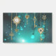 Chaves Douradas e antigas com engrenagens e marcadores penduram em correntes douradas sobre fundo verde luminoso.
