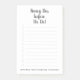 Uma lista de verificação divertida para o seu marido-a-ser, certifique-se de que ele não esqueça todo o seu casamento para fazer! Este design apresenta um título editável em uma fonte de estilo escrita com pincel de cinza escura que lê "Honey Dos Before We Do!" acima das caixas de seleção e linhas. Personalize a parte inferior com seu nome/aprovação. Isto faz um presente de noivado excelente.