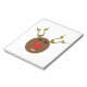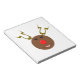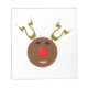 Este incrível bloco de anotações mostra uma engraçada caricatura de uma Reindeer. Ele tem olhos pretos e um nariz brilhante e vermelho brilhante. Os chifres estão apontando para cima e parecem fazeres futuristas que esta rena é uma ciberrena. Ele ainda é bonito e amigável.