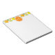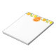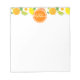Um bloco de notas branco com um padrão de caracteres cor de laranja, limão, toranja e limão sorridentes com folhas verdes. No topo está uma combinação de nome e monograma que pode ser personalizada. A plataforma é, na sua maioria, vazio com bastante espaço para escrevendo.