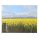 Um campo de flores amarelas brilhantes se estende sob um céu parcialmente nublado, com montanhas visíveis à distância. Uma cerca de madeira no primeiro plano adiciona um toque rústico à paisagem. Esta imagem foi tirada perto de Ararat, em Victoria, Austrália.