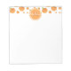 Um bloco de anotações branco com borda de pêssegos sorridentes com folhas verdes. No topo está uma combinação de nome e monograma que pode ser personalizada. A plataforma é, na sua maioria, vazio com bastante espaço para escrevendo.