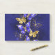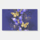 Composição de borboletas luxuosas de safira e joias de ouro em fundo azul texturizado.