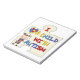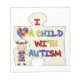 Uma parte grande do quebra-cabeça, um coração compor de partes do quebra-cabeça, uma figura menina de cabelo triguenha da vara, e o texto que me lê "amam uma criança com autismo" em t-shirt da consciência do autismo, em canecas, em cartões, em etiquetas, em sacolas, em ímãs, em chaveiro, em jornais, em mousepads, e em outros artigos do roupa e do presente.
