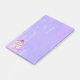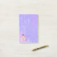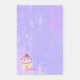 Notas adesivas de grande tamanho com uma ilustração de um cupcake delicioso. Glacé rosa e garoa de chocolate. Um cupcake amarelo e uma framboesa no topo. Meu Deus! O fundo é uma textura de abstrato roxo com pequenos corações salpicados por todo o lado.