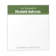Este da mesa do bloco de notas tem texto de exibição branco no topo. A parte superior é verde florestal. Há duas linhas de texto branco na área verde. A linha de cima diz "Da Mesa De". A segunda linha é para o nome do destinatário. Na parte inferior, há texto verde da floresta para informações de contato, como endereço de e-mail e número de telefone. O texto pode ser editado ou apagado conforme desejado.