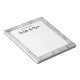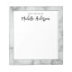 O bloco de anotações tem uma elegante borda de mármore branca. Na parte superior da área branca do escrevendo, há texto preto que pode ser editado ou excluído para criar uma mensagem personalizada. (Mostrado: NA MESA DE Michelle Anderson). A linha do nome é um roteiro elegante que se parece com uma assinatura cursiva.