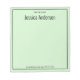 Este da mesa do bloco de notas tem texto preto no topo. Há um texto grande de exibição em preto para o nome do destinatário no topo. Há texto preto menor na parte inferior para informações de contato, como um endereço de e-mail e número de telefone. A fronteira é um quadrado preto. O papel é verde-claro.