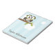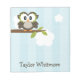 Uma coruja marrom e verde limão bonitinha sentada num galho folheado com uma nuvem azul listrada e branca. Este bloco de notas personalizado da coruja, giro e kawaii, pode ser personalizado com seu nome ou o que você quiser dizer. Trabalho de arte © Chrissy H. Studios, LLC. Todos os Direitos Reservados.