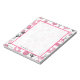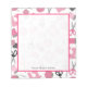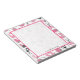Um bloco de notas com design de costura, constituído por uma máquina de costura, colheres de rosca, uma almofada de pinos, tesouras, tecidos e agulhas de costura. Design tem um esquema de cor rosa.