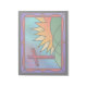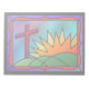 Um design de vidro manchado ilustrando a manhã da Páscoa, com uma cruz vermelha sobre colinas verdes ao lado de um nascer de sol feroz.