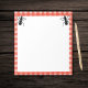 Este bloco de notas é branco com uma borda de xadrez vermelha e branca que se assemelha a uma toalha de mesa piquenique com duas formigas pretas grandes e divertidas no topo.