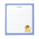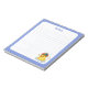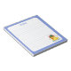 Bloco de notas bonito com ilustração de um patinho amarelo vestindo um guarda-chuva colorido nadando em um lago na chuva, no canto inferior direito. Um espaço escrevendo branco com linhas azuis sobre fundo azul. Na parte superior dos blocos de notas em texto azul está a palavra notas, esta é uma modelo que pode ser usada como está ou substituída com o seu texto on usando a caixa de texto.