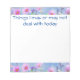 Bloco de notas engraçado com o texto "Coisas que posso ou não fazer hoje" escrito a tinta azul. Design de flor em cima e em baixo.