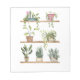 Placas plantadas são exibidas. Três filas de plantas em prateleiras. Cores d'água pintadas à mão.