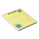 Um bloco de notas amarelo claro com linhas verticais pretas e uma ilustração mostrando um belo buquê verde-esverdeado de folhas tropicais no canto superior direito e no canto inferior esquerdo.