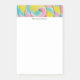 Notas pegajosas com uma foto deliciosa. Uma foto macro de um pirulito. Cor azul rosa e amarelo pastel em um padrão espiral.