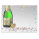 Saudações ao feliz ano novo escritas em uma garrafa espumante, este texto é totalmente personalizável. O número do ano é apresentado na rolha junto à garrafa espumante. Confete festivo e colorido no chão e belo boque elegante no fundo.