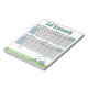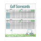 Golf themed notepad, with three scorecards on each page. Colorful watercolor graphics, on the bottom of each page, has a golf card, grassy green and a hole flag, with ball.