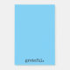 Um bloco de anotações azul adesivo com a palavra 'grata' na parte inferior.