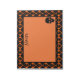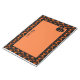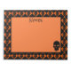 Padrão de harlequina vibrante de diamantes negros e laranja com crânios pretos assustadores.