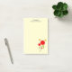 Notas pegajosas personalizadas com uma ilustração esbranquiçada de várias flores vermelhas com grandes corações acoplados a um caule com folhas verdes. 2 borboletas amarelas quentes pairando nas proximidades. Fundo amarelo claro.