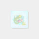 Pequenas notas pegajosas com uma ilustração fofinha de um lagarto tropical verde rodeado por folhas e flores de cor azul-turquesa. Uma sobreposição semitransparente colocada sobre o topo para dar à imagem uma aparência desbotada.