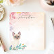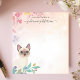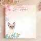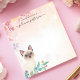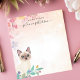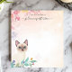 Mostre seu amor por gatos siameses com este adorável bloco de notas personalizado! Uma ilustração encantadora de um gato siamês, com olhos azuis impressionantes, espreita do canto inferior esquerdo, cercado por flores e folhagens delicadas. O fundo suave e pastel aumenta o apelo gentil do design. Personalize este bloco de notas com seu próprio texto. Perfeito para amantes de gatos, listas de tarefas ou notas rápidas.