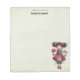Um bloco de notas com uma imagem retrô fofa apresentando uma menina caprichosa com bochechas rosadas e flores no cabelo. Carregando uma boneca de sapo verde.