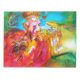 Caráter mascarada veneziano colorido, caprichoso e vibrante. Uma loura sofisticada e bonita está sentada com uma rosa vermelha e uma máscara de penas na mão com tecidos espumantes de ouro, de um figurino barroco mascarado, com penas e um cachorro. Pintura em aquarela com cores brilhantes, cor-de-rosa amarela, verde, faíscas douradas e folha prateada, inspirada em personagens da Comédia de Arte ( Commedia dell' Arte ), Carnaval de Veneza e máscaras de penas venezianas. Este design legal e artístico é também um belo presente para ocasiões especiais, aniversários, natal, Dia de os namorados, Mardi Gras ( Fat Terça ).