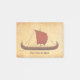 Uma nave longa Viking com uma vela vermelha vista no perfil do lado direito e sobreposta a uma imagem de fundo de papel antiga. Personalize adicionando seu próprio texto.