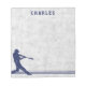 Bloco de notas personalizado com uma silhueta azul escura de um jogador de beisebol tocando um taco de baseball em um fundo de bola vestido. No fundo há uma borda com duas listras azuis. Nome personalizável ou outro texto em uma fonte de esportes de camisa azul-escura na faculdade.
