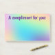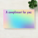 Um belo punhado de notas pegajosas, perfeito para elogiar colegas de trabalho, familiares ou estranhos! Espalhe o amor! Aqui estão alguns exemplos de elogios que você pode dar! "Você é tão talentoso!" "Obrigados por ser um amigo tão forte e solidário!" "Você está fazendo um trabalho excelente ficando calmo durante tempos difíceis. Continue!" "Seu cabelo é fantástico!" "Admiro o quão positivo você é!"