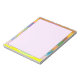 Este Bloco de notas x 6" de 5,5" tem 40 páginas, apresenta um design de várias cores nas bordas com uma área escrevendo clara e roxa.