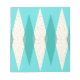 Este Notepad Moderno de Argyle Meio século apresenta um fundo vibrante e turquesa e um padrão de diamantes teais mod e translúcidos que sobrepõem diamantes maiores de creme de vintagem com coloração dourada, salgadinhos da idade espacial. Esse argumento minimalista inspirado e desconstruído é uma reviravolta simplista da era atômica maior que a vida que dominou a paisagem decoradora dos anos 1950 e 1960. Esta design de kitschy lembra tudo, desde os sinais de beco da boliche de Retro Palm Primaveras até as bandejas de televisão que você usou na casa da sua avó.