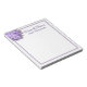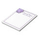 Tamanho do bloco de notas 5x6 com design de flores de hydrangea lavanda. Personalize duas linhas de texto no topo com nome comercial e local, ou qualquer texto. O papel branco é bordado em linhas finas em gradiente roxo.