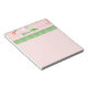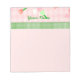 Este bloco de notas bonito é perfeito para qualquer escrevendo que você precise fazer. Ele apresenta um fundo cor-de-rosa e um design de flor no topo. As partes superior e inferior são separadas por um gráfico de uma fita verde e branca. Você personaliza o nome no topo.